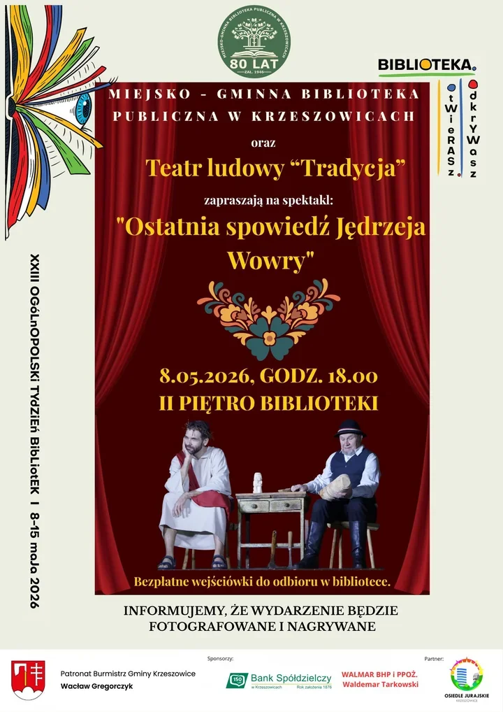 W krzeszowickiej bibliotece szykuje się wieczór z teatrem, który sięga do lokalnej historii i wyciąga z niej postać niemal zapomnianą. „Ostatnia spowiedź Jędrzeja Wowry” ma połączyć opowieść o sztuce, człowieku i końcu życia w formie, która nie idzie na łatwiznę 🎭